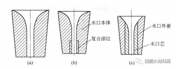 (3) 鑲嵌式定徑水口:鑲嵌式定徑水口分為外套和內(nèi)芯兩部分,分別制成后用耐火泥黏結(jié)在一起;水口本體一般為高鋁材質(zhì);內(nèi)芯為氧化鋯材質(zhì)。這種水口的制作成本低,抗熱震性好,氧化鋯的含量可依據(jù)不同的要求進行制作,所以產(chǎn)品的性價比較高,使用量較大。